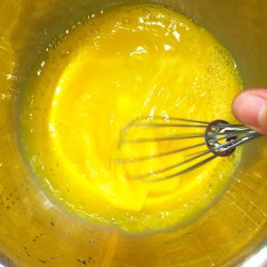 将蛋黄搅拌均匀,加入少许糖(不要全加入)