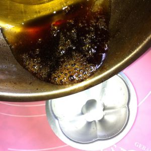 趁热把焦糖液倒进做布丁烧的容器里,放进冰箱冷藏待用