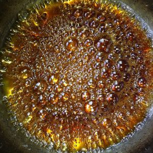 开始变色后把火调到最小,如果有颜色不均匀的情况,可以稍稍晃动锅子,等到变成比较深琥珀色以后就可以关火了