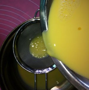 调好的鸡蛋奶液过筛两次,可以过滤出没融化的糖和蛋筋,然后再倒入布丁杯。