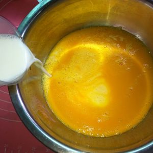 再来做第二层的布丁,3个鸡蛋+1个蛋黄,倒入细砂糖,搅拌均匀,再倒入60度左右的热牛奶(可以用微波炉高火加热2分钟),慢慢倒,并且要边倒边搅拌