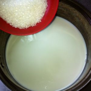 500g牛奶加入50g白糖 小火略煮至白糖溶化 奶锅开始冒小泡泡就行了