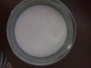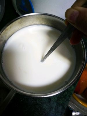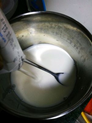 纯牛奶倒进胆内,再加入菌粉然后搅拌