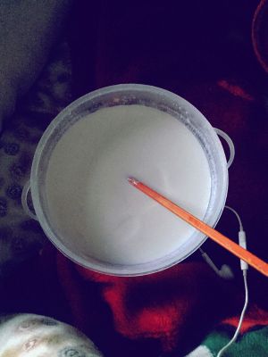 然后把酸奶倒进牛奶里搅拌,一定搅拌均匀!