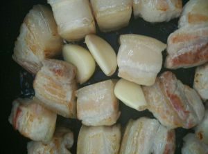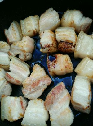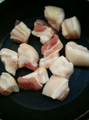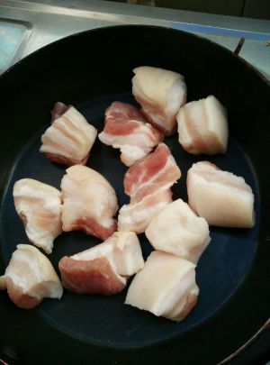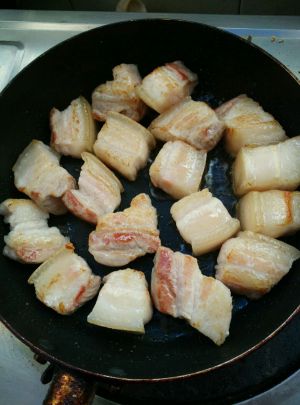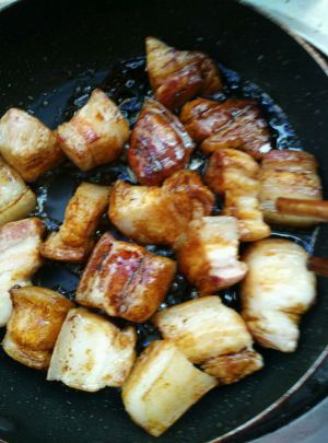 锅里不放油,放入肉,小火煸炒,逼出油脂。