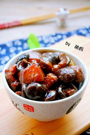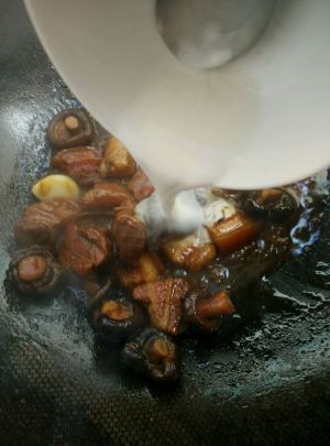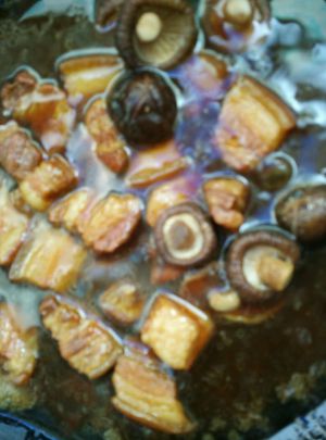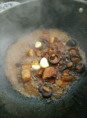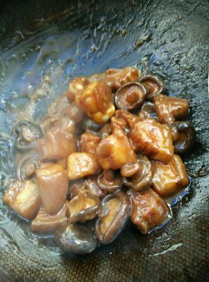 铁锅加热,将猪肉放入加生姜丝爆炒至猪肉出油,下泡发香菇的水、糖色、料酒烧制10分钟.