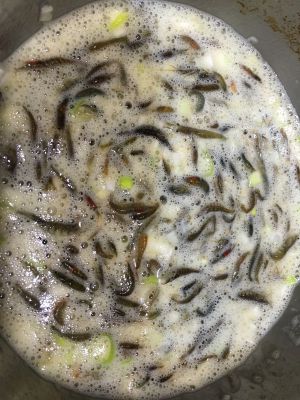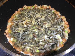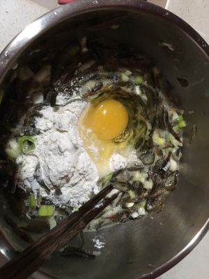 放入小河虾,鸡蛋,面粉少许