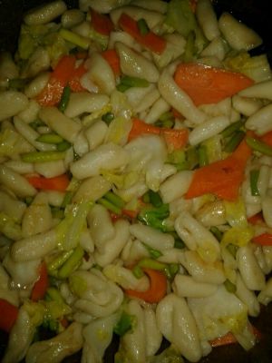8.锅里放油,把葱蒜先放入锅里,再放入切好的葫萝卜,蒜台,回子白,炒几分钟后,再把煮好的猫耳朵一起下锅翻炒几下,就可以出锅啦