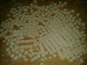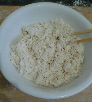 和面。向面粉中少量少量加水,用筷子拌成絮状,注意最后要留一点干面粉。