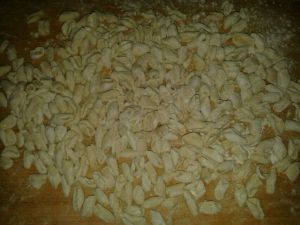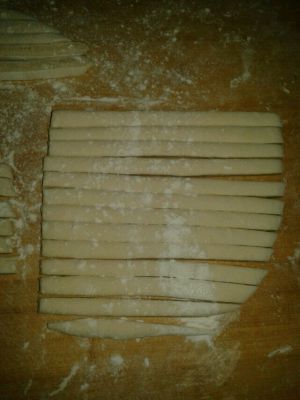 拿起一根面条,揪下一小块,大约大拇指指甲盖那么大,从靠近身体这边向前抿去,一个小的猫耳朵就出来了。