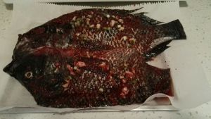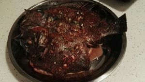 第一步先把鱼洗净对剖成两半,然后放料酒、辣椒面、五香粉、孜然粉、十三香、蒜泥、姜末、葱花、盐、鸡精,盖上保鲜膜腌制2小时