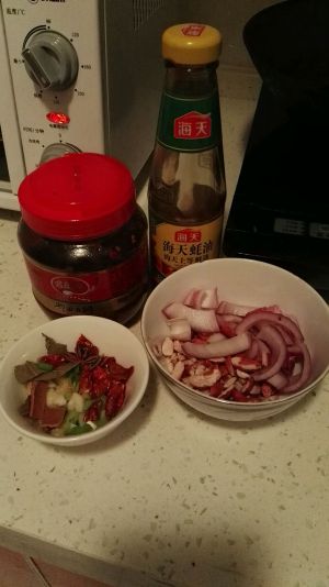 在等待烤鱼的过程中可以准备辅料,葱姜蒜切末,干辣椒剪段,一颗八角,一片香叶,少许桂皮,洋葱和花生米适量,俾县豆瓣酱,耗油,杏鲍菇切成小片(杏鲍菇我是炒好的忘了照)