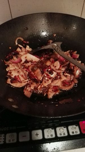 炒香后放入花生米、洋葱继续炒,因为杏鲍菇是熟的所以我最后放的,如果生炒的话和洋葱一块放入炒