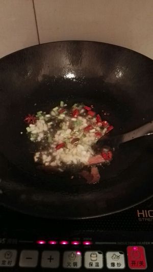 锅里放适量油,油热后放入葱姜蒜末桂皮八角香叶干辣椒段爆香