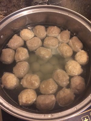 等虾子红了之后就可以倒入先前准备好的所有素材和肉丸(鹌鹑蛋晚些放,比较容易烂),洒适量的盐巴。