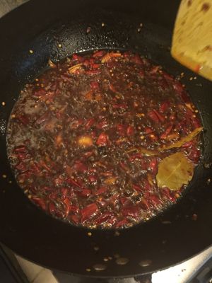 食用油(量多点),热油炒陴县豆瓣、葁、蒜、八角三个、香叶、丁香十粒、炒香。
