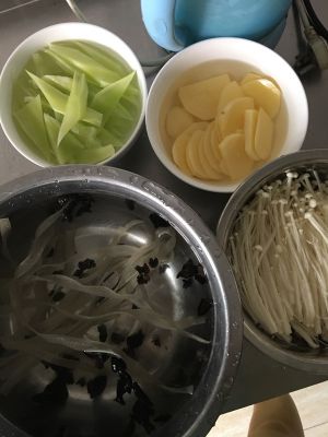 把土豆 胡萝卜 笋切片,豆腐切块,将豆腐 土豆 胡萝卜开水过一遍。