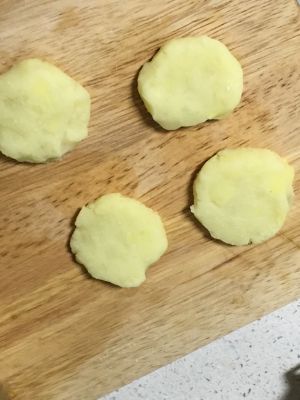 搅拌完成。在手上抹点油,将土豆泥做成小块的饼,防止沾手!