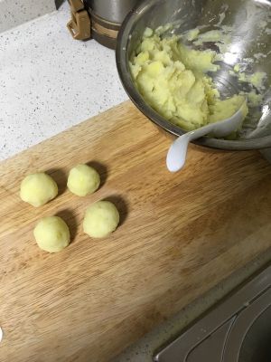 2、土豆蒸熟后盛到盆里压成泥,搓成圆球状;