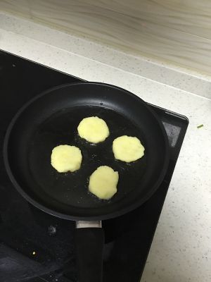4、平底锅倒入少许油,放入土豆饼,一面煎黄后翻面再煎,直至两面均呈金黄色;