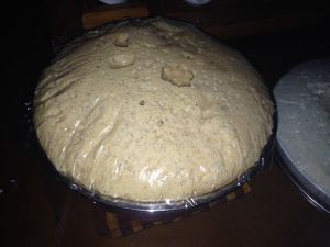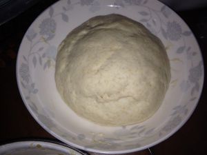 面粉(我买的全麦粉,所以看起来有点麦麸的深色点点)加酵母(安琪干酵母,袋子上有用量比例)和成面团,盖保鲜膜静置。