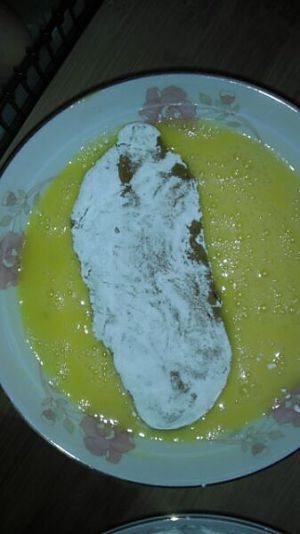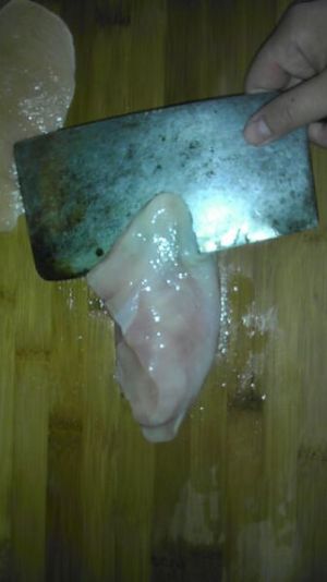整块鸡胸肉从厚度的中间横着刨开,刨到底部不切断,把鸡肉展开,拍打松软。(我用擀面杖)