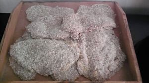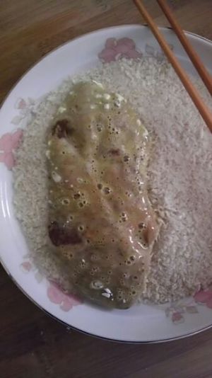 鸡胸脯肉合好,依次蘸淀粉、蛋液、最后裹上面包糠