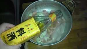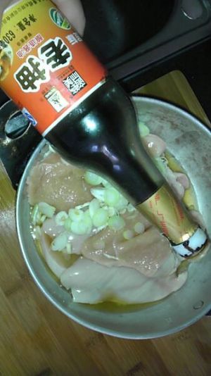 加生抽、料酒、姜片、盐和黑胡椒腌制鸡肉,盖保鲜膜入冰箱冷藏半小时。