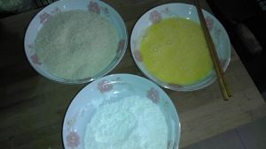 准备好淀粉和面包屑,鸡蛋打成蛋液