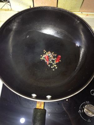 热锅到油放入干辣椒,花椒,炸油,把花椒辣椒捞出