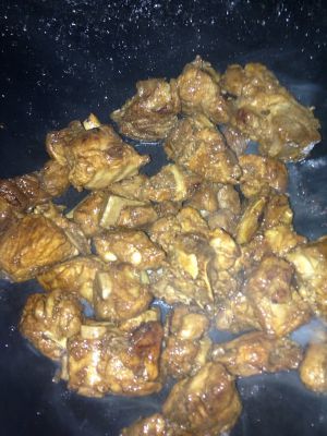 当糖熬化变成褐色后下入排骨翻炒均匀。注意!小心油溅出来烫伤