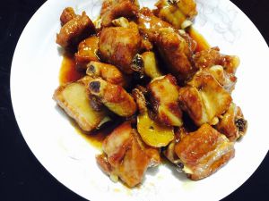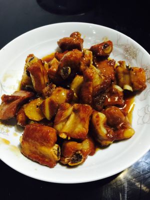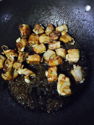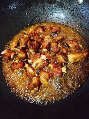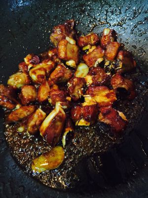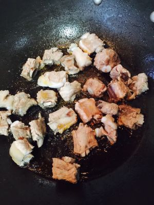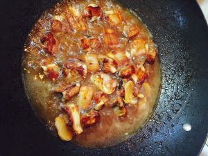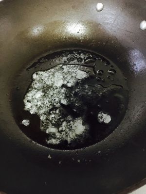 热锅少量冷油,下敲碎的冰糖,小火加热至冰糖融化颜色变褐色,冒泡!