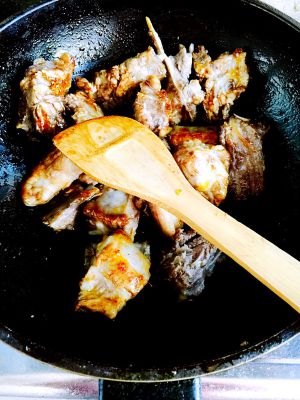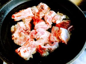 放入炒锅,干炒,加入排骨继续干炒,加入3块冰糖。 过程中一直不放油哦。