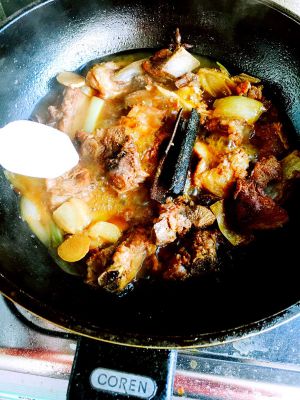 中火放入排骨翻炒,使糖色充分上色,放入酱油翻炒上色,最后放入料酒,鸡精,姜,蒜,桂皮,香叶,大料,枣,干辣椒,枸杞翻炒均匀。加入开水没过排骨中火盖上盖子焖煮30分钟