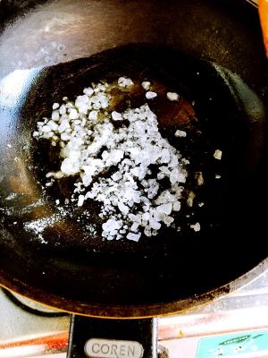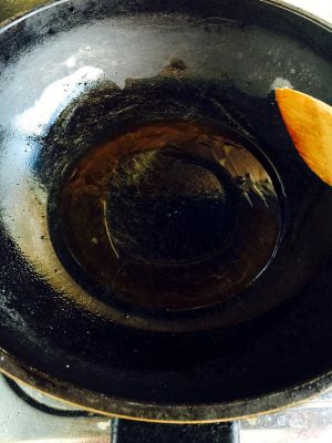 把冰糖敲碎,锅里放入少量的油,把碎冰糖放进去,小火熬糖。