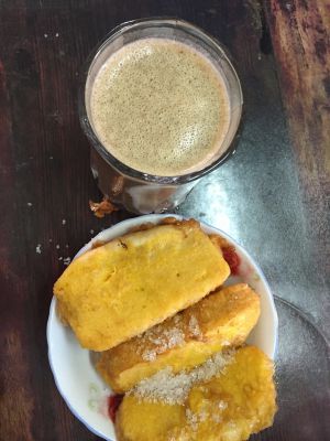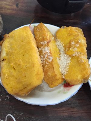 白馒头一个切片,锅内放少许油,小火,煎至两面金黄,装盘放白糖,千万别炸硬了哦,这个就香香软软的,保留了馒头原有的味道
