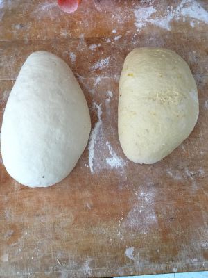 面粉,南瓜泥,白砂糖和酵母混合均匀,揉成光滑面团。南瓜泥含水量不同,不要一次性把南瓜泥全加入面团中,视情况增减用量。
