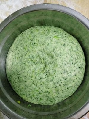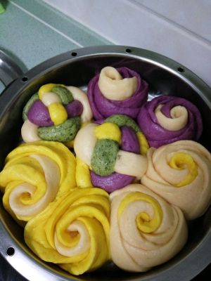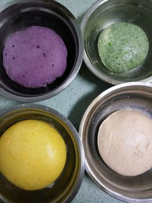 紫薯、南瓜去皮蒸熟碾压成泥,菠菜、西红柿榨汁,分开加入适量酵母、糖和一点奶粉和成面团,放入盆中盖上保鲜膜置室温下发酵。