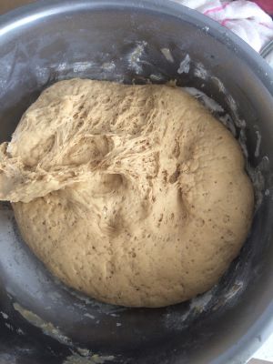 全麦粉300克加入红枣泥和3克酵母粉融化的酵母水,揉成面团。(因为全麦面粉有麸质,面团较高筋面粉粗糙且成型效果差)