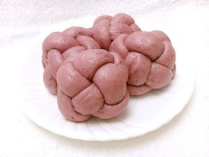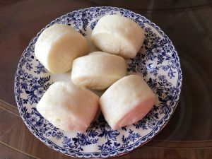 将紫薯去皮,切丁,蒸熟,放凉备用。