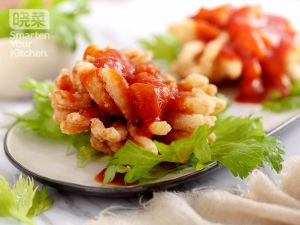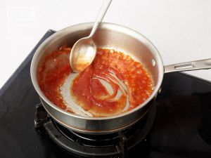 锅内放入少许油倒入番茄沙司、糖、水搅拌收汁。