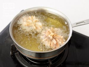 将油锅烧热油,将拍好粉的菊花鱼放油锅炸。