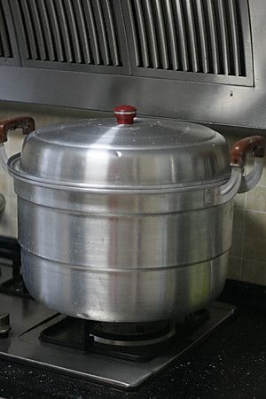 将腌好的鱼头剖面朝下摆入一个大圆盘中,蒸锅水烧热,上汽后,将鱼放入蒸锅中,注意,坨坨妈用的是剁椒鱼头专用的大蒸锅,所以可以将鱼和鱼盘正放蒸,如果家里只有小蒸锅的话,可取一小盘,将鱼反放着蒸,蒸好以后再取一大盘反扣过来就可以了