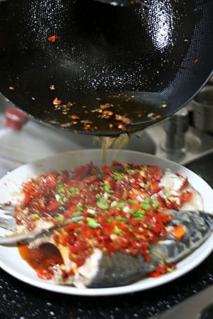 再把鱼头用盘子装着,把爆炒好的料铺在鱼头上面,然后拿到锅里蒸10分钟左右就可以了,味道超级棒的