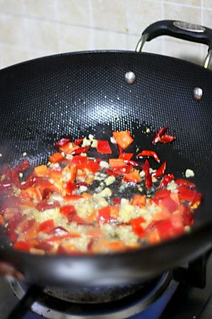 然后把蒜头剁碎,在和剁椒一起放入锅内爆炒至香味出来