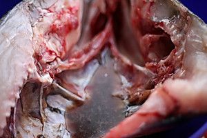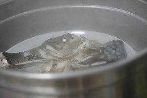 以前都是用三斤左右的鱼头做的,今天这个鱼头有六斤,所以取了一半来做,鱼头洗净备用,注意一下,里面的“黑衣”一定要洗干净。