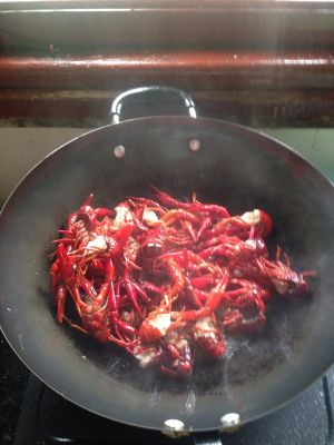 锅内放油,油八成热,放口味虾油爆。爆到所有虾身变红卷起,再翻炒3分钟。口味虾捞出来放碗里。