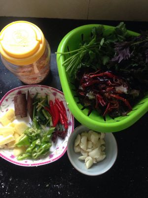 锅内的油不要倒掉,现在把桂皮、姜、蒜、青椒、红椒煸香后。再放料酒、生抽,加辣椒灰,炒2分钟。把油爆过的口味虾放入锅中翻炒。放2勺盐。放紫苏。