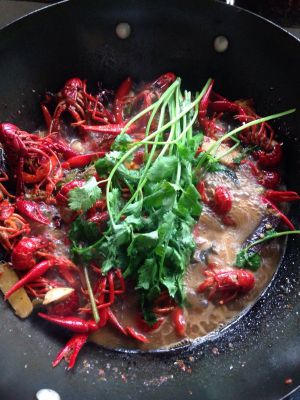 倒入小龙虾爆炒,10分钟后倒入啤酒,煮干收汁为止,加入鸡精,蒜段出锅~