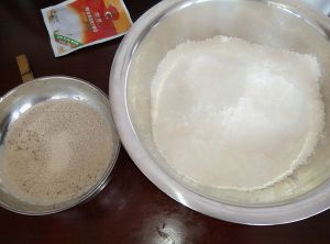 面粉,酵母,白糖,酵母加不高于30℃的水化开。